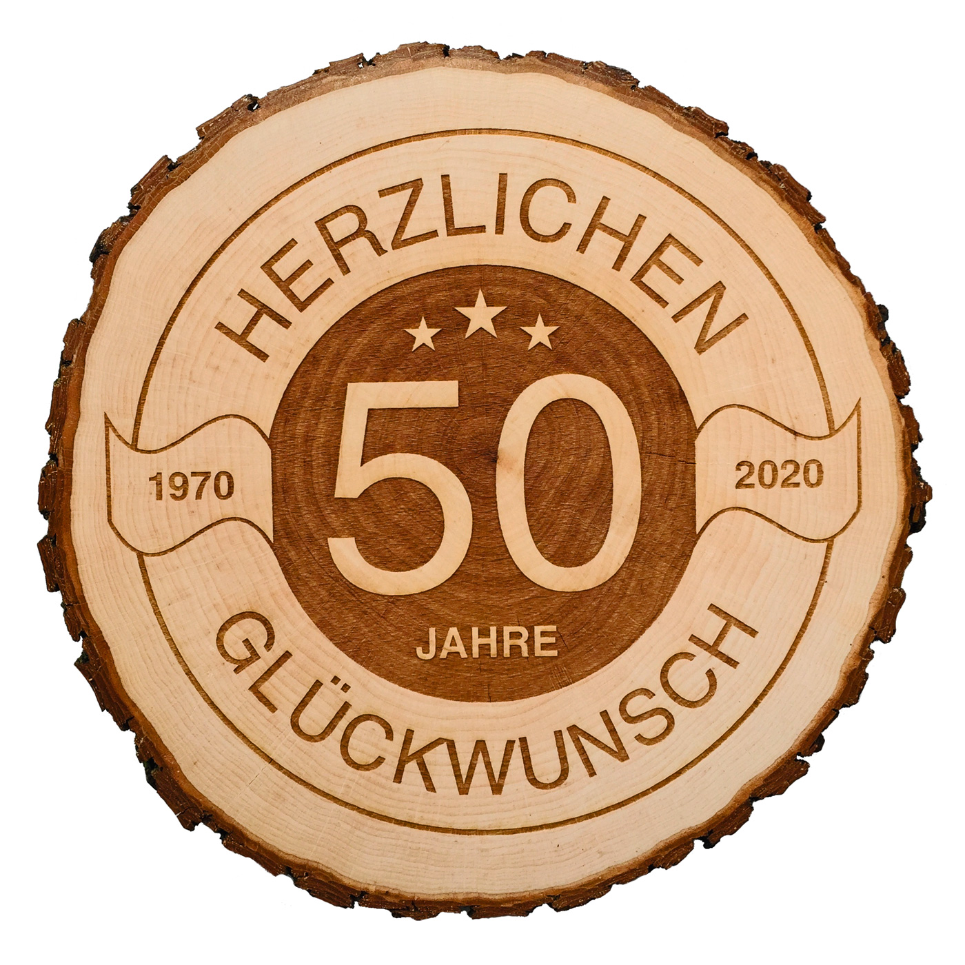 Hier kannst Du eine Baumscheibe mit einem “Herzlichen Glückwunsch” Motiv selbst gestalten. Dabei kannst Du aus drei verschiedenen Größen wählen und die Jahreszahlen, sowie das Alter in der Mitte selbst bestimmen. Die Schriftart ist dabei immer die auf den Produktfoto abgebildete. So startest Du: Wähle einfach zuerst die gewünschte Größe und passe dann die Zahlen nach Deinen Wünschen an.